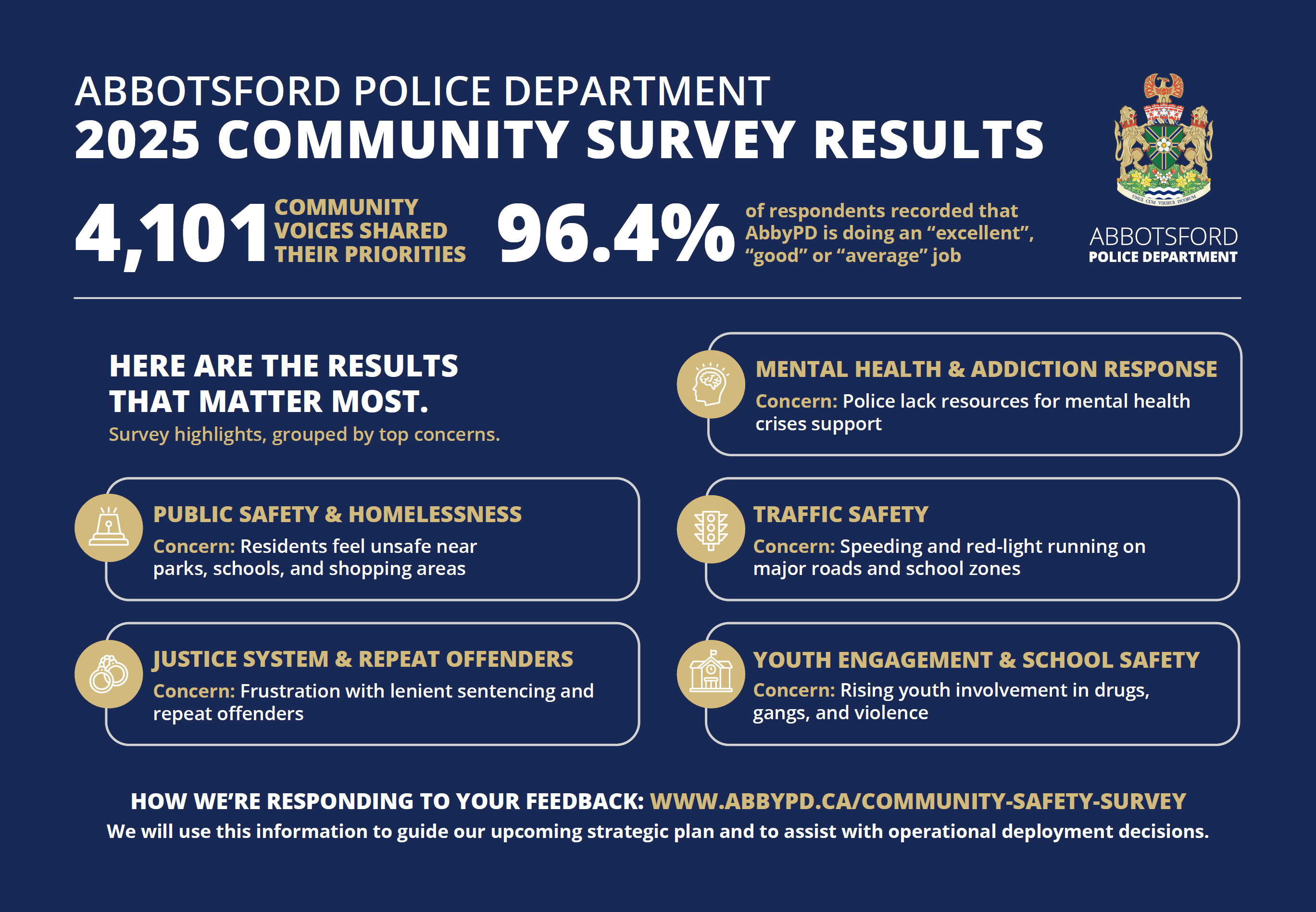 AbbyPD has officially begun its strategic planning process to develop a new Strategic Plan that will guide policing priorities and community safety for the years ahead. This plan represents an evolution from previous strategies and will be inclusive, evidence-based, and aligned with statutory responsibilities. Community input is essential—your voice matters. The feedback received through the Community Safety Survey will be used to ensure the plan reflects the needs of Abbotsford residents. The final Strategic Plan will strengthen safety, trust, and service excellence across our community.